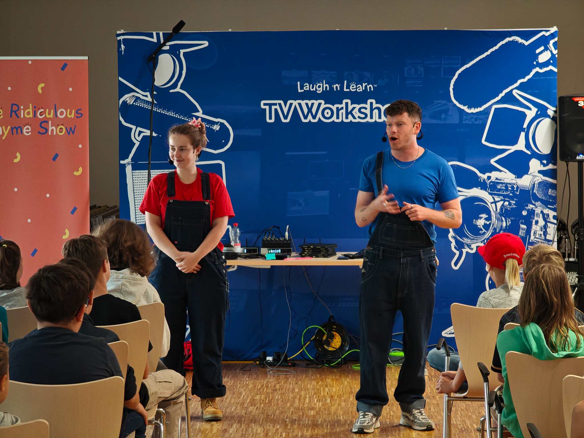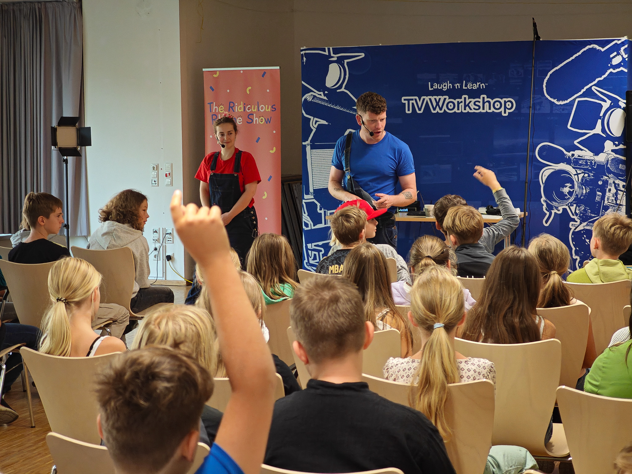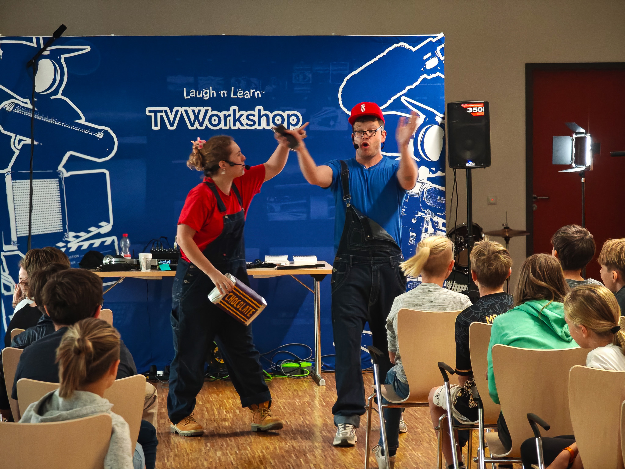 Die beiden Workshop-Leiter Richard und Kate nahmen die Schülerinnen und Schüler mit hinter die Kulissen eines Fernsehsets, welches dafür im Weinberghaus eingerichtet wurde. Dabei erfuhren alle, welche Jobs an einem Filmset wichtig sind, von der Regie über Kamera und Ton bis hin zu den Schauspielern. Anschließend ging es in die Praxis: Eine kurze Story wurde live mit viel Herz und Witz produziert und alle Schülerinnen und Schüler konnten in verschiedenen Rollen mitmachen. Das Ergebnis: viel Gelächter, spannende Einblicke in die Welt des Fernsehens und vor allem jede Menge neue Erfahrungen.
