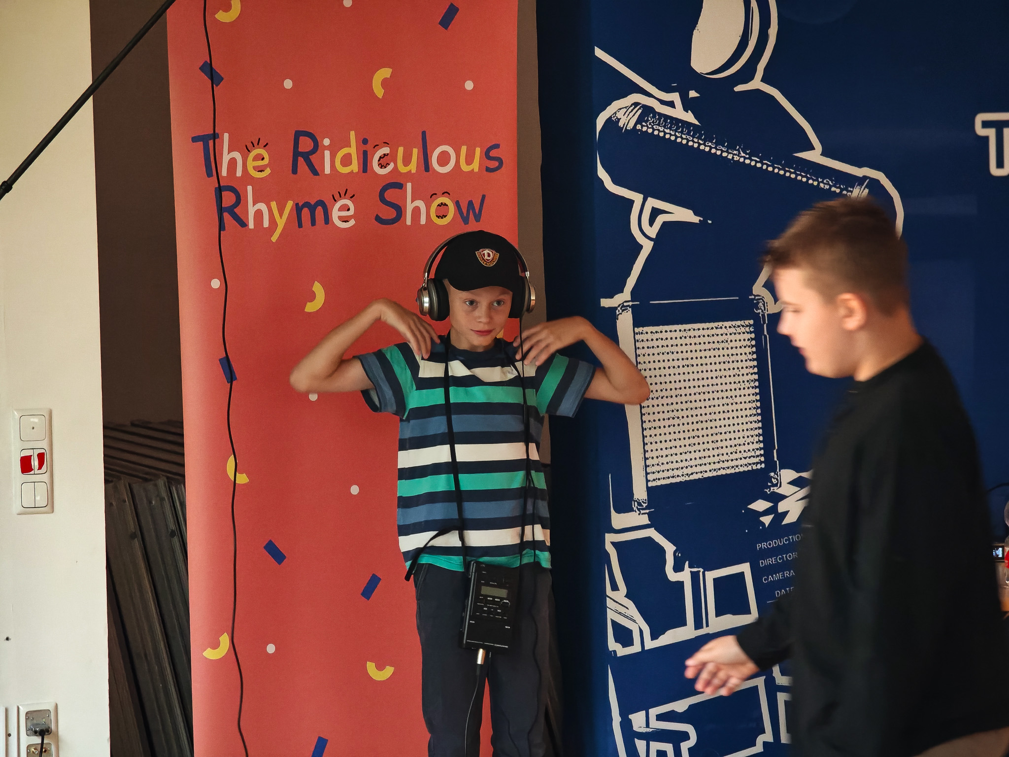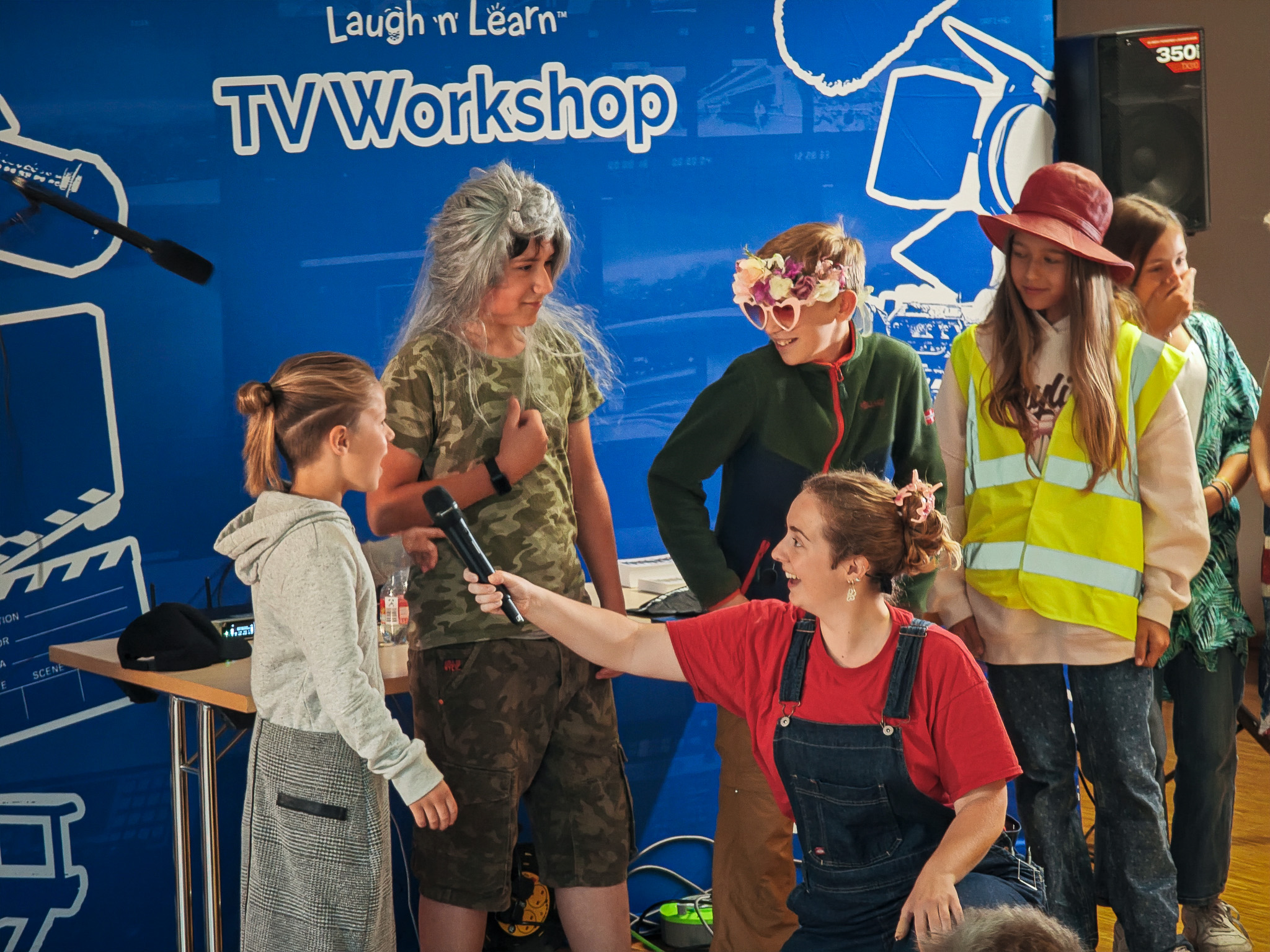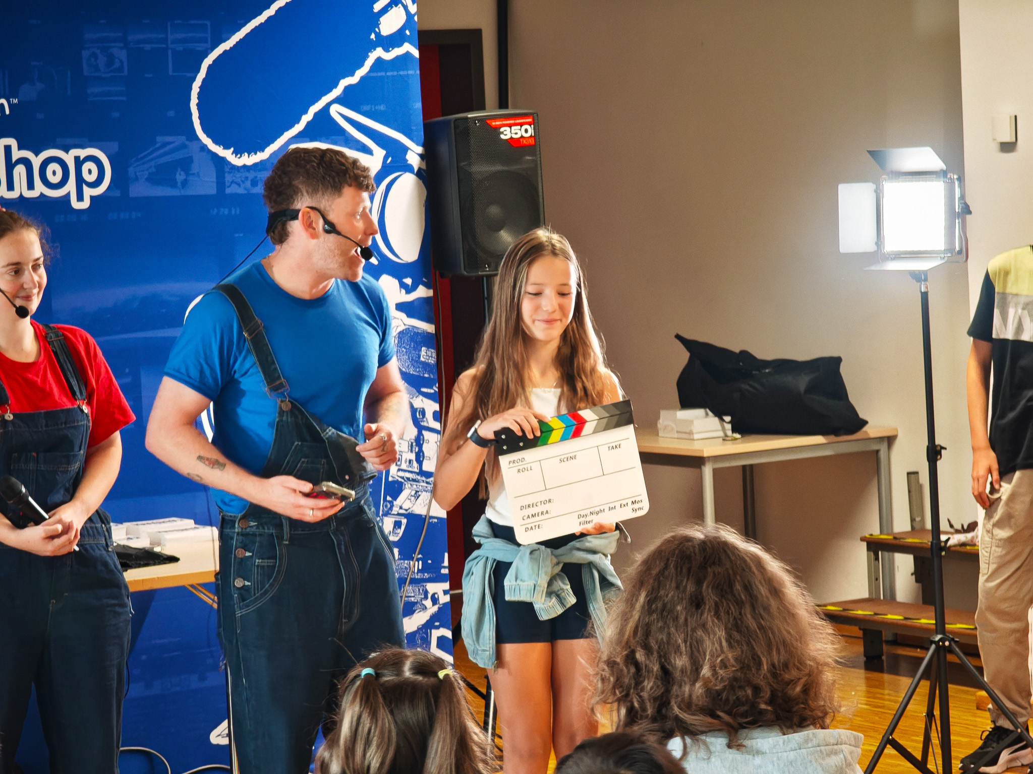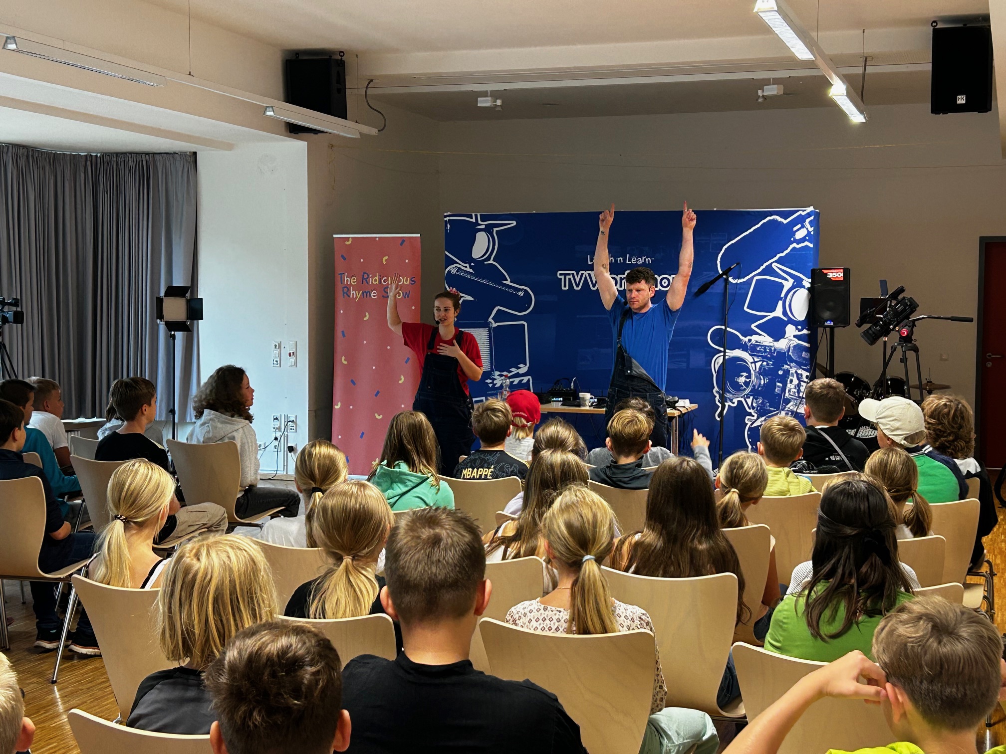 Die beiden Workshop-Leiter Richard und Kate nahmen die Schülerinnen und Schüler mit hinter die Kulissen eines Fernsehsets, welches dafür im Weinberghaus eingerichtet wurde. Dabei erfuhren alle, welche Jobs an einem Filmset wichtig sind, von der Regie über Kamera und Ton bis hin zu den Schauspielern. Anschließend ging es in die Praxis: Eine kurze Story wurde live mit viel Herz und Witz produziert und alle Schülerinnen und Schüler konnten in verschiedenen Rollen mitmachen. Das Ergebnis: viel Gelächter, spannende Einblicke in die Welt des Fernsehens und vor allem jede Menge neue Erfahrungen.